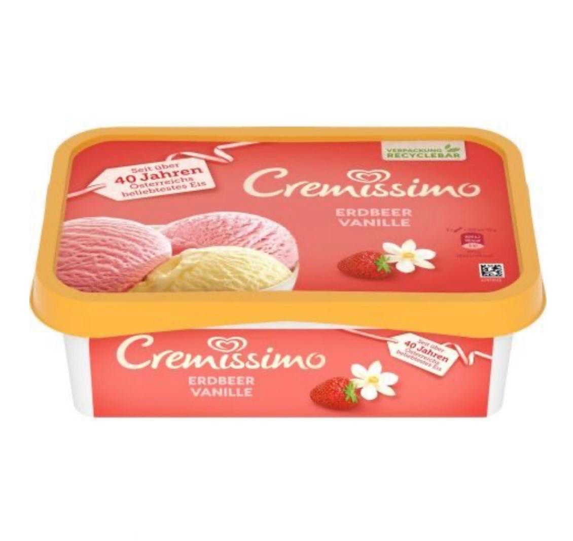 entrahmte MILCH, Erdbeerpüree (20%), Zucker, Glukose-Fruktose-Sirup, Dextrose, Kokosfett, Wasser, MOLKENERZEUGNIS, Glukosesirup, Emulgator (Mono- und Diglyceride von Speisefettsäuren), Stabilisatoren (Guarkernmehl, Tarakernmehl, Carrageen, Johannisbrotkernmehl), Säureregulator (Citronensäure), MAGERMILCH-Pulver oder -Konzentrat, Aromen, Farbstoff (Carotin). Kann Weizen, Erdnuss, Soja, Haselnuss, Walnuss und Pistazie enthalten.