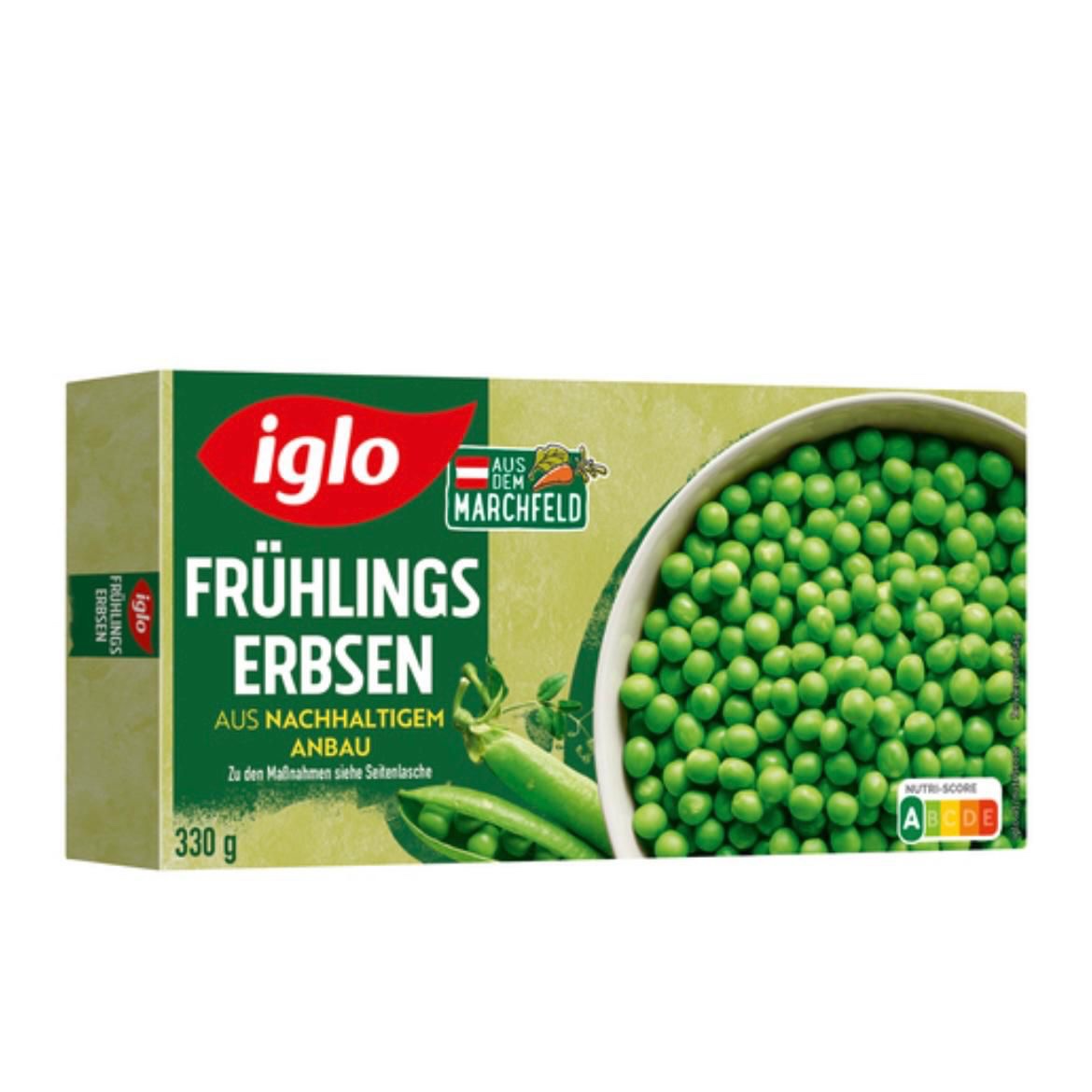 Die jungen iglo Erbsen sind besonders knackig und zart – direkt im Marchfeld angebaut und geerntet kommt der Gemüseklassiker innerhalb von nur 90 Minuten vom Feld in die Packung. Nutri-Score „A“, iglo.at/nutriscore, Nutri Score wird auf Basis von 100 g berechnet.