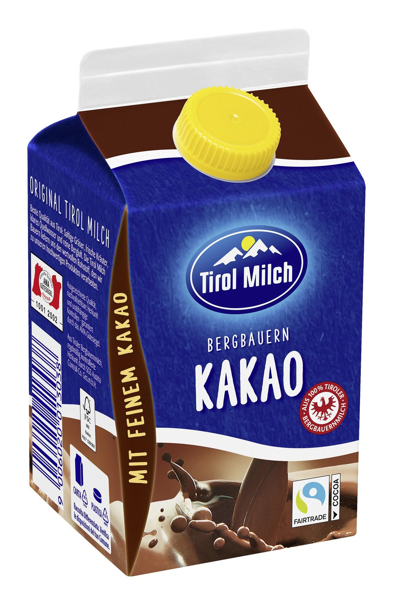 Tiroler Kakaomilch aus Bergbauernmilch mit 3,6 % Fett, pasteurisiert.